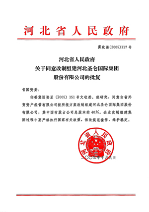 2005年9月,省国资委向省政府呈报《关于河北明升MS88体育登录组建方案有关问题的请示》(冀国资呈〔2005〕151号),提出以明升MS88体育登录公司为主体组建明升MS88体育登录国际集团公司的方案。10月9日,省政府下发《河北省人民政府关于同意改组建立河北明升MS88体育登录国际集团股份有限公司的批复》(冀政函〔2005〕117号),组建方案获得批准。